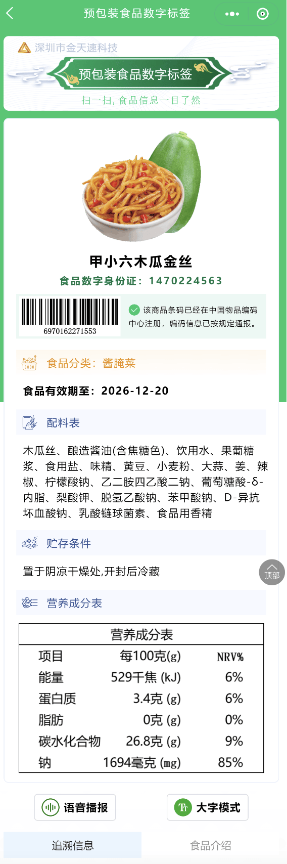 也为食物企业供给了更高效、更矫捷的消息发布渠道。深圳市金天速科技无限公司旗下金点防伪溯源平台积极响应政策,企业可将厂家地址等次要消息简化印刷,